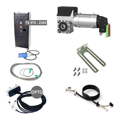 GFA aandrijving, type SE 9.24-25,40 DES WS SK. Complete set bestaande uit: Montagesteun, besturingskast TS 970 (230 Volt), optische onderloopbeveiliging (optosensoren) en verbindingskabel 7 meter.