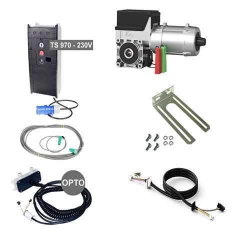 GFA aandrijving, type SE 9.24-25,40 DES WS ER. Complete set bestaande uit: Montagesteun, besturingskast TS 970 (230 Volt), optische onderloopbeveiliging (optosensoren) en verbindingskabel 7 meter.