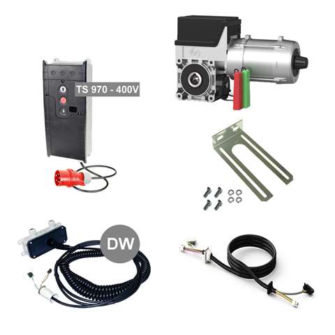 GFA aandrijving, type SE 9.24-25,40 DES ER. Complete set bestaande uit: Montagesteun, besturingskast TS 970, pneumatische onderloopbeveiliging (DW) en verbindingskabel 7 meter.