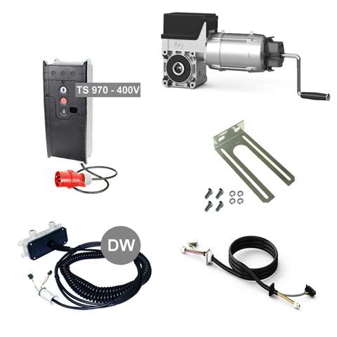 GFA aandrijving, type SE 9.24-25,40 DES NHK. Complete set bestaande uit: Montagesteun, besturingskast TS 970, pneumatische onderloopbeveiliging (DW) en verbindingskabel 7 meter.
