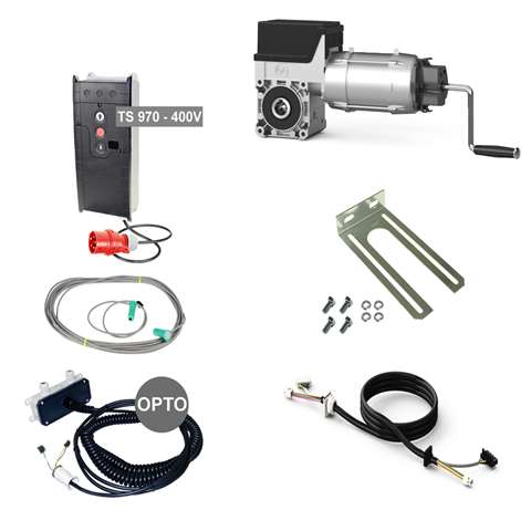 GFA aandrijving, type SE 9.24-25,40 DES NHK. Complete set bestaande uit: Montagesteun, besturingskast TS 970, optische onderloopbeveiliging (optosensoren) en verbindingskabel 7 meter.