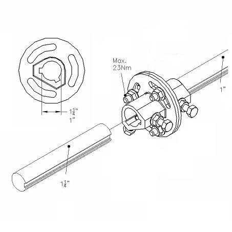Verstelbare as-koppeling. Asdiameter verloopt van 25,4 mm (1 inch) naar 31,75 mm (1,25 inch).