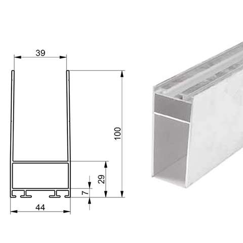 Verhoogd U-profiel voor zowel top- als bodempanelen, met een dikte van 40 mm. Max. lengte 7400 mm. Aluminium geanodiseerd.